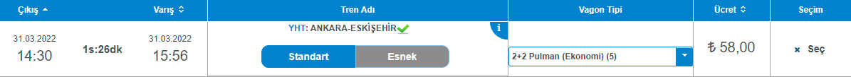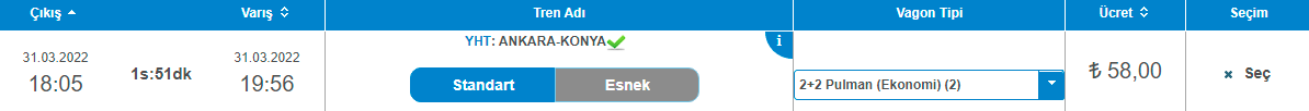 En son 30 Mart 2022 tarihinde Ankara-İstanbul Yüksek Hızlı Tren (YHT) bilet fiyatları 118,50 TL'den satılıyordu.