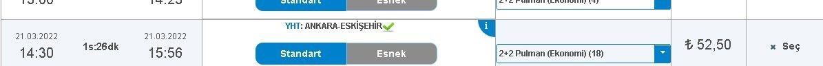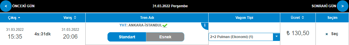 31 Mart 2022 tarihinden itibaren Ankara-İstanbul Yüksek Hızlı Tren (YHT) bilet fiyatları 118,50 TL'den 130,50 TL'ye yükseldi.