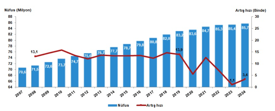 Yıllık nüfus artış hızı 2023 yılında binde 1,1 iken, 2024 yılında binde 3,4 oldu.