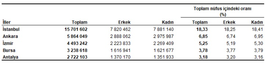 İstanbul'un nüfusu, bir önceki yıla göre 45 bin 678 kişi artarak 15 milyon 701 bin 602 kişi oldu. Türkiye nüfusunun %18,3'ünün ikamet ettiği İstanbul'u, 5 milyon 864 bin 49 kişi ile Ankara, 4 milyon 493 bin 242 kişi ile İzmir, 3 milyon 238 bin 618 kişi ile Bursa ve 2 milyon 722 bin 103 kişi ile Antalya izledi.