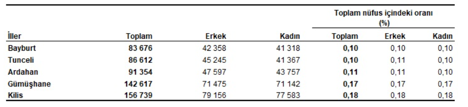 Bayburt, 83 bin 676 kişi ile en az nüfusa sahip olan il oldu. Bayburt'u, 86 bin 612 kişi ile Tunceli, 91 bin 354 kişi ile Ardahan, 142 bin 617 kişi ile Gümüşhane ve 156 bin 739 kişi ile Kilis takip etti.