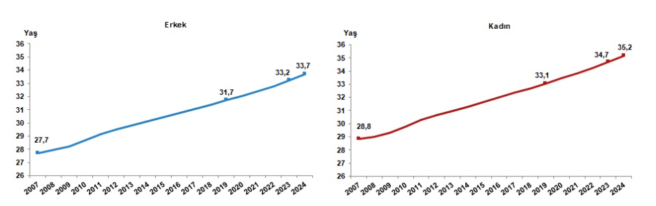 Türkiye'de 2023 yılında 34 olan ortanca yaş, 2024 yılında 34,4'e yükseldi. Cinsiyete göre incelendiğinde, ortanca yaşın erkeklerde 33,2'den 33,7'ye, kadınlarda ise 34,7'den 35,2'ye yükseldiği görüldü.
