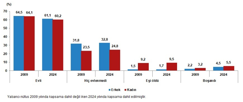 Ülkemizde 2009 ve 2024 yılı cinsiyete göre medeni durumun dağılımı incelendiğinde, erkeklerde hiç evlenmeyenlerin oranının kadınlara göre daha yüksek olduğu, kadınlarda ise eşi ölenlerin ve boşananların oranının erkeklerden daha fazla olduğu görüldü. Diğer yandan büyük çoğunluğu oluşturan evlilerin oranının 2009 ve 2024 yılında her iki cinsiyette de birbirine yakın oranlarda olduğu görüldü.