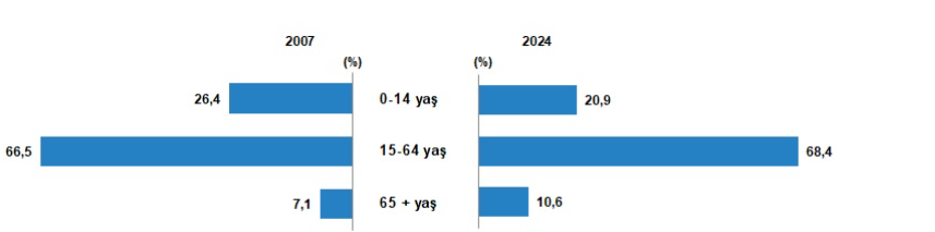 Çalışma çağı olarak tanımlanan 15-64 yaş grubundaki nüfusun oranı, 2007 yılında %66,5 iken 2024 yılında %68,4 oldu. Diğer yandan çocuk yaş grubu olarak tanımlanan 0-14 yaş grubundaki nüfusun oranı %26,4'ten %20,9'a gerilerken, 65 ve daha yukarı yaştaki nüfusun oranı ise %7,1'den %10,6'ya yükseldi.