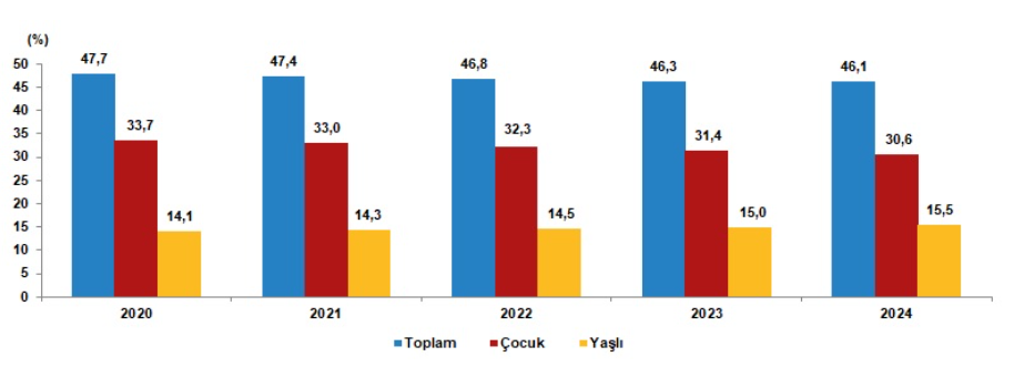 Çalışma çağındaki birey başına düşen çocuk ve yaşlı birey sayısını gösteren toplam yaş bağımlılık oranı, 2023 yılında %46,3 iken 2024 yılında %46,1'e düştü. Çalışma çağındaki birey başına düşen çocuk sayısını ifade eden çocuk bağımlılık oranı, %31,4'ten, %30,6'ya gerilerken, çalışma çağındaki birey başına düşen yaşlı birey sayısını ölçen yaşlı bağımlılık oranı ise %15'ten %15,5'e yükseldi. Diğer bir ifadeyle, Türkiye'de 2024 yılında, çalışma çağındaki her 100 kişi, 30,6 çocuğa ve 15,5 yaşlıya bakmaktadır.