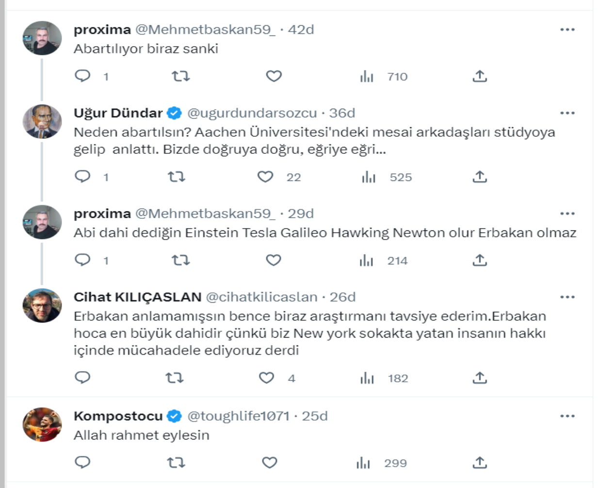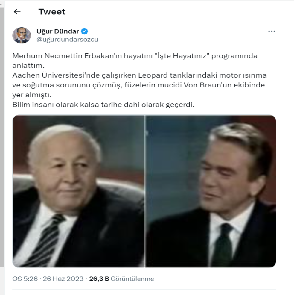 İsim vermeden Enver Aysever’i eleştiren Uğur Dündar ise Necmettin Erbakan’ın tarihteki yerini anlattı. Dündar yaptığı paylaşımda, “Merhum Necmettin Erbakan'ın hayatını "İşte Hayatınız" programında anlattım. Aachen Üniversitesi'nde çalışırken Leopard tanklarındaki motor ısınma ve soğutma sorununu çözmüş, füzelerin mucidi Von Braun'un ekibinde yer almıştı. Bilim insanı olarak kalsa tarihe dahi olarak geçerdi.” dedi.