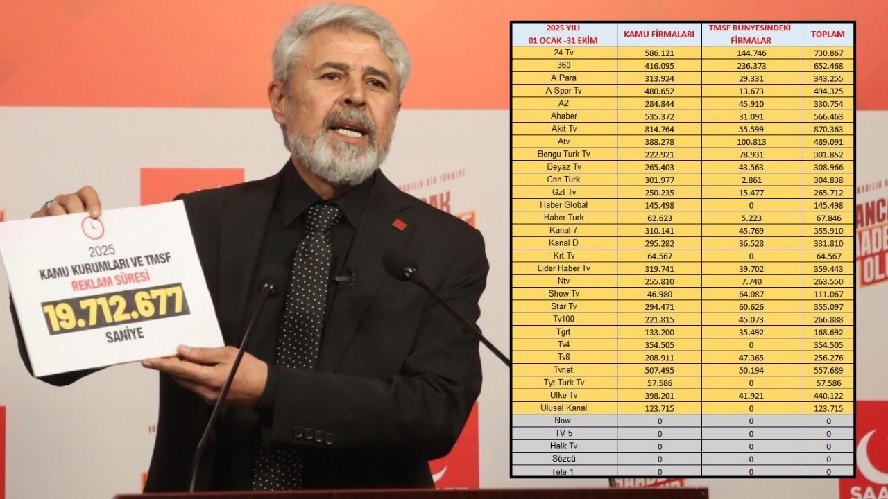 Saadet Partisi Genel Başkan Yardımcısı Mustafa Yılmaz, 2025 yılında kamu şirketleri tarafından televizyon kanallarına verilen reklam sürelerine ilişkin çarpıcı veriler paylaştı. Yılmaz’ın açıkladığı tabloya göre, 01 Ocak–31 Ekim 2025 tarihleri arasında kamu şirketlerinden belirli televizyon kanallarına toplam 19 milyon 712 bin 677 saniye reklam verildi.