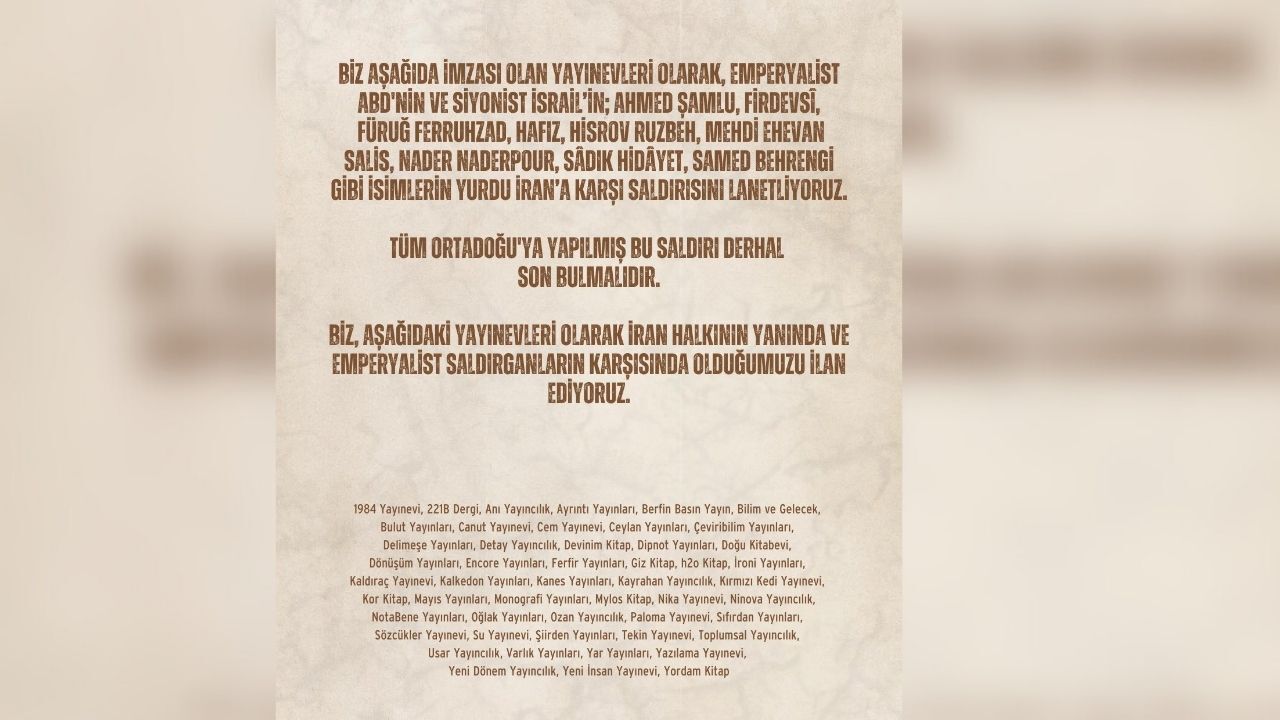 BİZ AŞAĞIDA İMZASI OLAN YAYINEVLERİ OLARAK, EMPERYALİST ABD'NİN VE SİYONİST İSRAİL'İN; AHMED SAMLU, FİRDEVSI, FÜRUĞ FERRUHZAD, HAFIZ, HISROV RUZBEH, MEHDİ EHEVAN SALİS, NADER NADERPOUR, SADIK HİDAYET, SAMED BEHRENGİ GİBİ İSİMLERİN YURDU İRAN'A KARŞI SALDIRISINI LANETLİYORUZ.