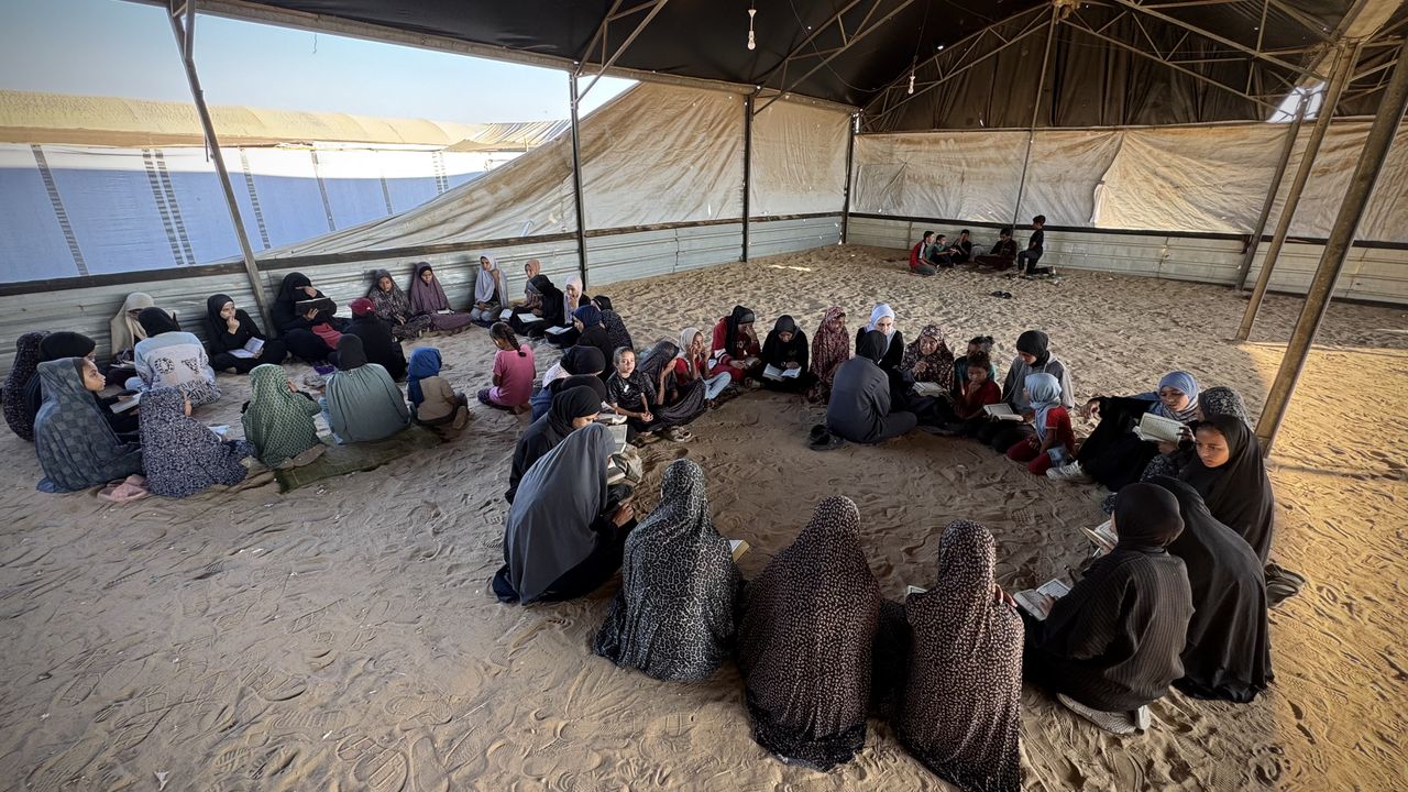 İsrail’in ablukası ve saldırıları nedeniyle yerinden edilen 73 yaşındaki Sadiye Subihi, Gazze Şeridi’nin güneyindeki Mevasi bölgesinde kurulan mülteci kampındaki çocuklara ve genç kızlara Kur’an-ı Kerim eğitimi veriyor.