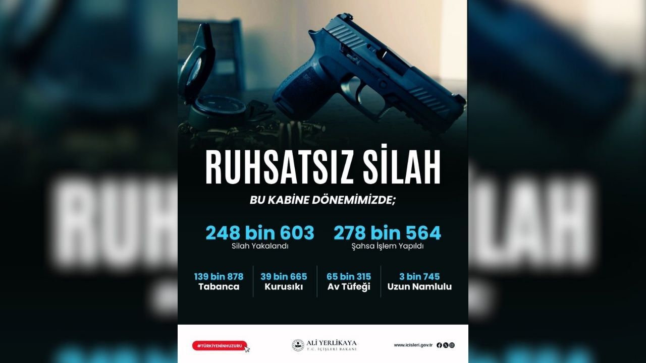 Bakan Yerlikaya, bu kabine döneminde düzenlenen operasyonlarda 139 bin 878 ruhsatsız ve 39 bin 665 kurusıkıdan çevrilme tabanca, 65 bin 315 ruhsatsız av tüfeği ve 3 bin 745 uzun namlulu silah olmak üzere 248 bin 603 silahın ele geçirildiğini ve 278 bin 564 şüpheli hakkında işlem yapıldığını belirtti.