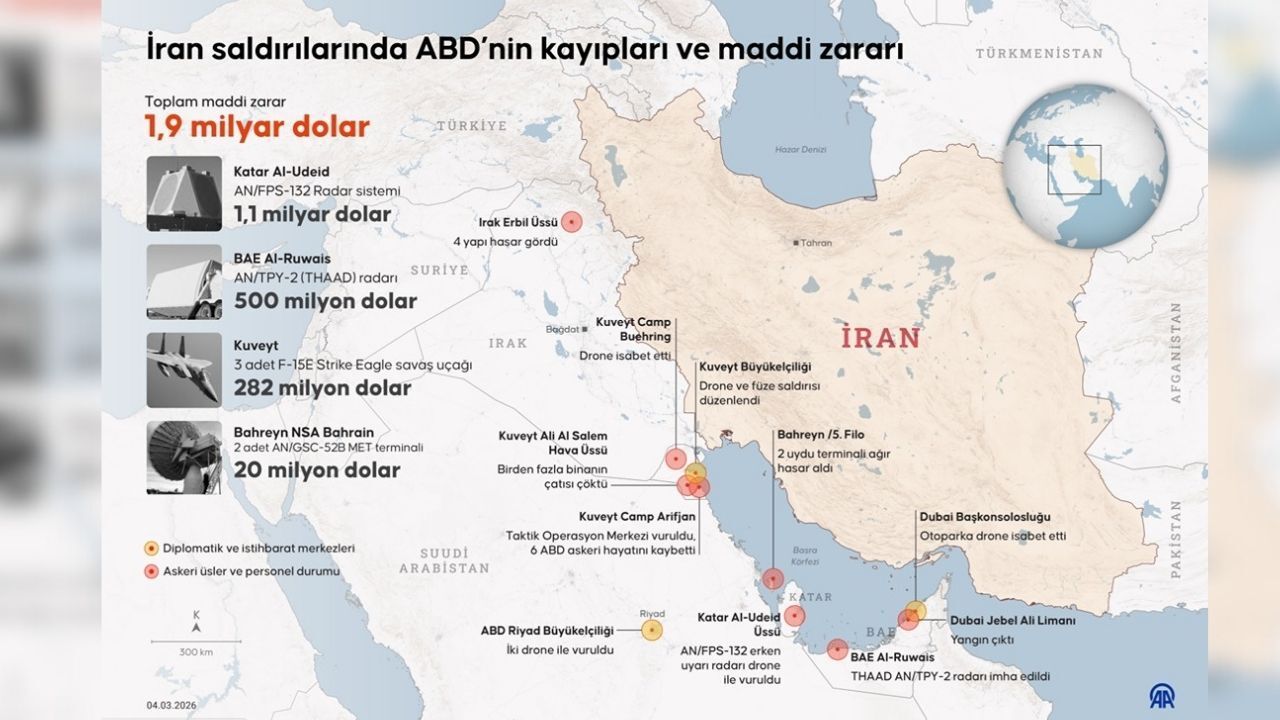 AA muhabirinin açık kaynaklardan derlediği tahmin ve verilere göre, ABD-İsra*l saldırılarının başladığı 28 Şubat'tan bu yana İran'ın bölgedeki ABD askeri varlıklarına verdiği zarar toplam 1,902 milyar dolara ulaştı.