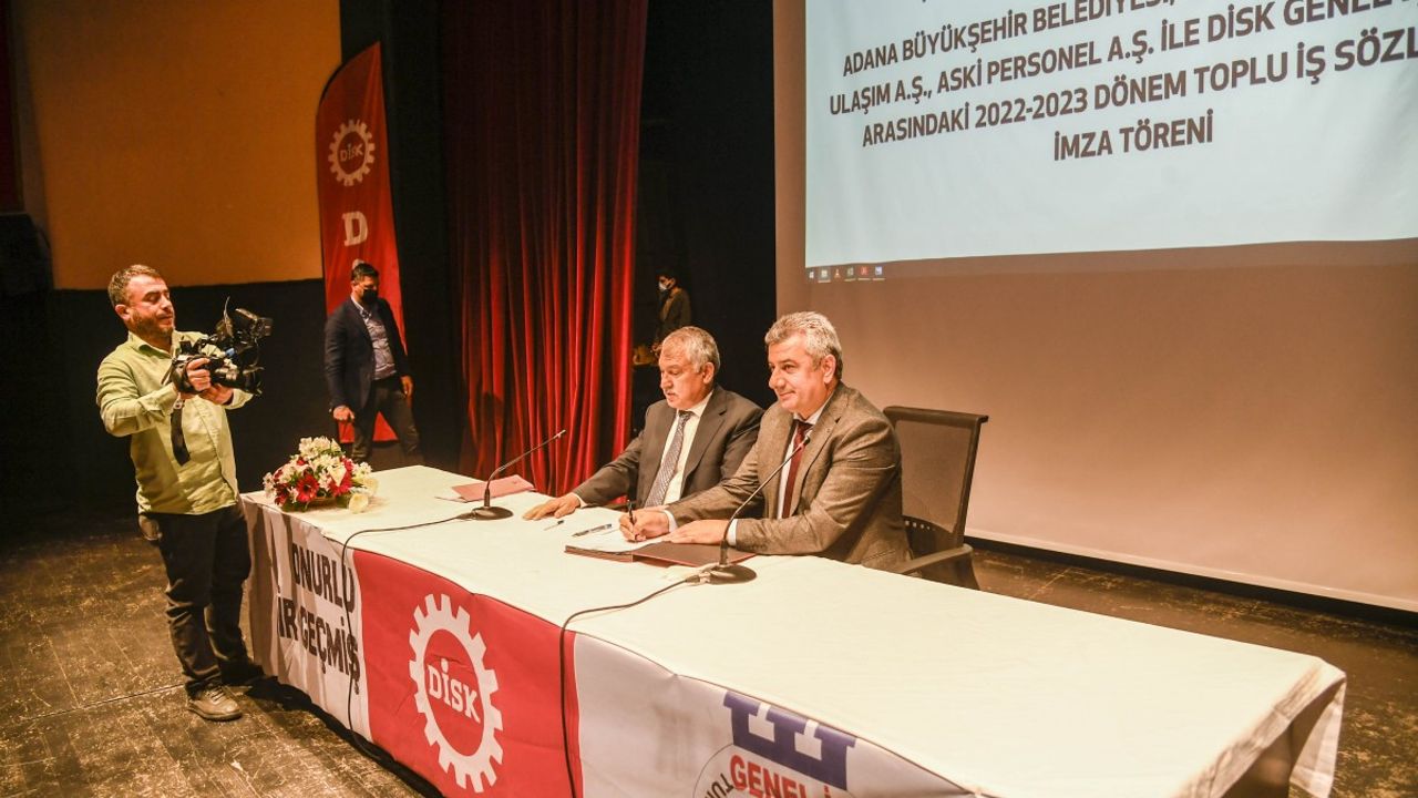 Adana Büyükşehir Belediyesi, Ulaşım AŞ, ASKİ Genel Müdürlüğü, ASKİ Personel AŞ ile DİSK Genel Sendikası arasında, 2022-2023 Dönemi Toplu İş Sözleşmesi imza töreni, Adana Büyükşehir Belediyesi Tiyatro Salonu’nda gerçekleştirildi.