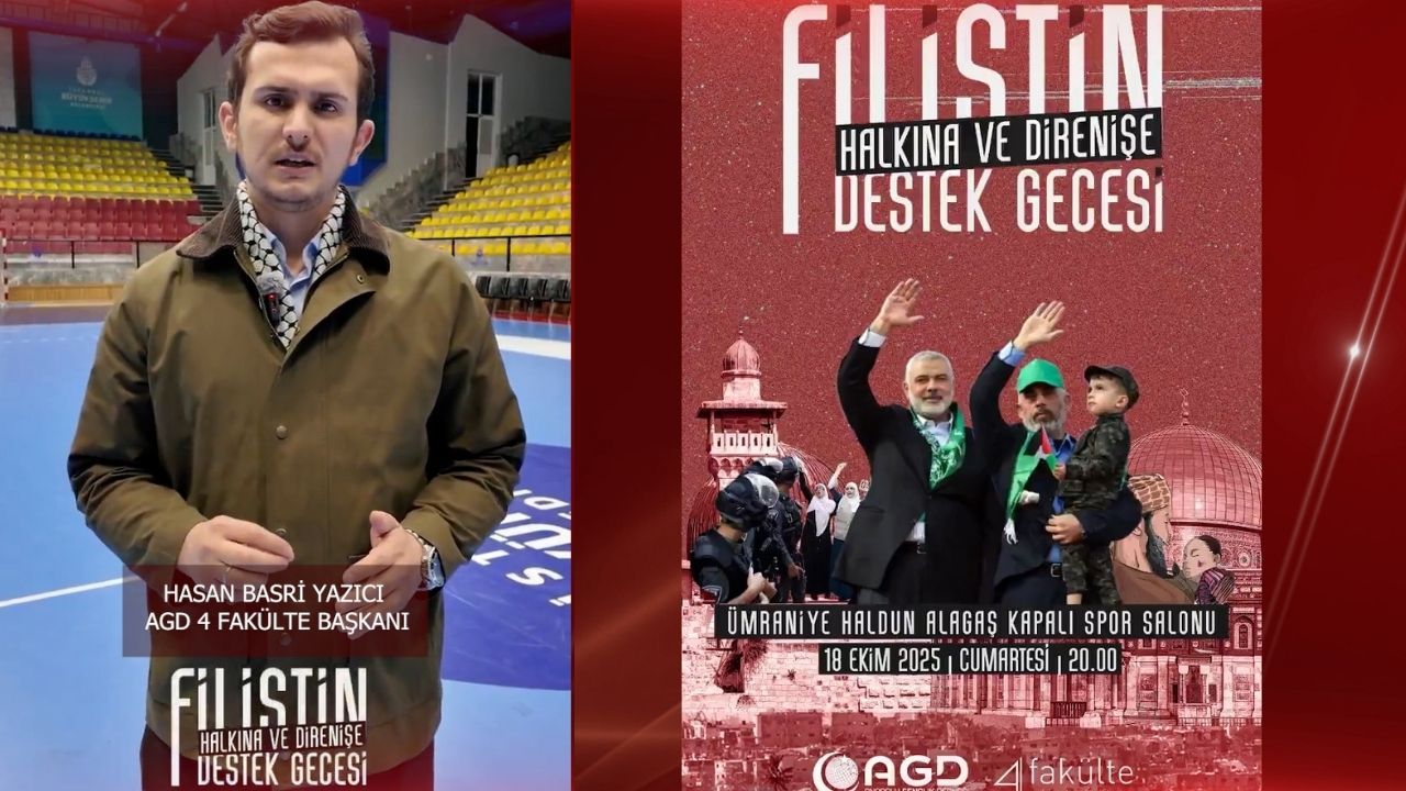 Anadolu Gençlik Derneği İstanbul Üniversiteler Komisyonu (4 Fakülte) tarafından 18 Ekim Cumartesi, saat 20.00'de İstanbul/Ümraniye Haldun Alağaş Kapalı Spor Salonu'nda Filistin Halkına ve Direnişe Destek Gecesi düzenlenecek.