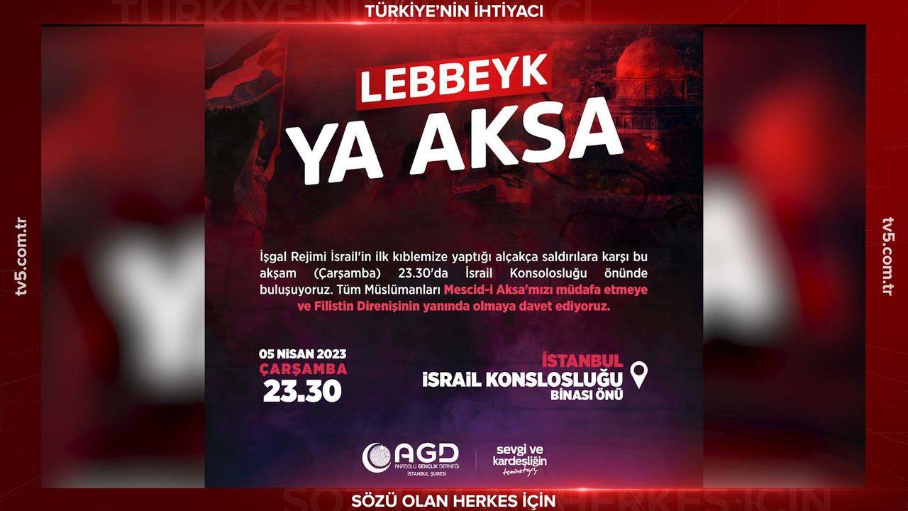 LEBBEYK YA AKSA! İşgal Rejimi İsrail'in ilk kıblemize yaptığı alçakça saldırılara karşı bu akşam (Çarşamba) 23.30'da İsrail Konsolosluğu önünde buluşuyoruz. Tüm Müslümanları Mescid-i Aksa'mızı müdafa etmeye ve Filistin Direnişinin yanında olmaya davet ediyoruz.
