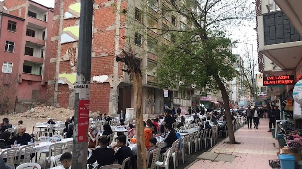 Bazı davetliler hasarlı olduğu için boşaltılan binaların önünde iftarını açtı. İftarın yapıldığı sokakta yıkım için boşaltılan 3 bina buluyor.
