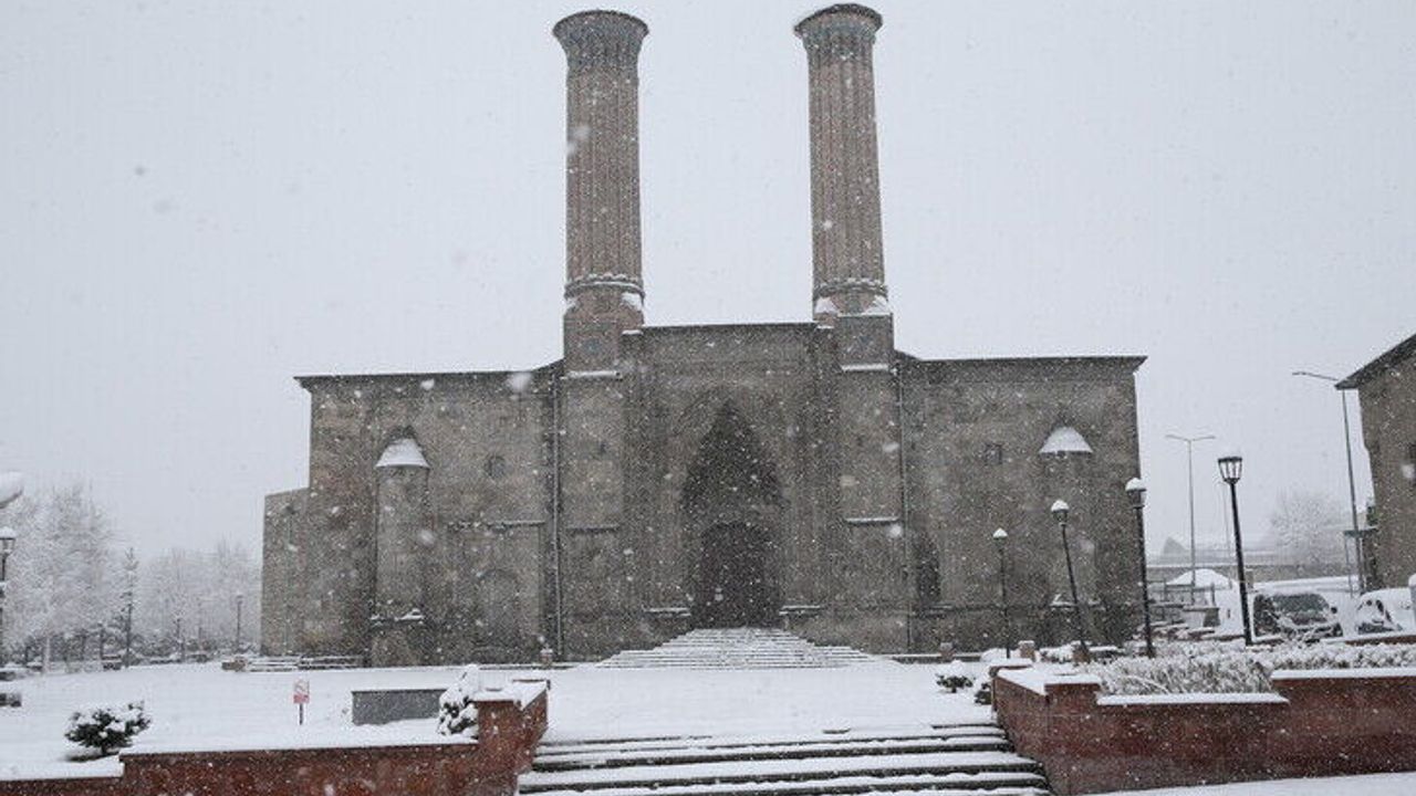 Karla kaplanan Çifte Minerale Medrese, Erzurum Kalesi ve Ulu Cami ile Atatürk Üniversitesi yerleşkesi dronla görüntülendi.