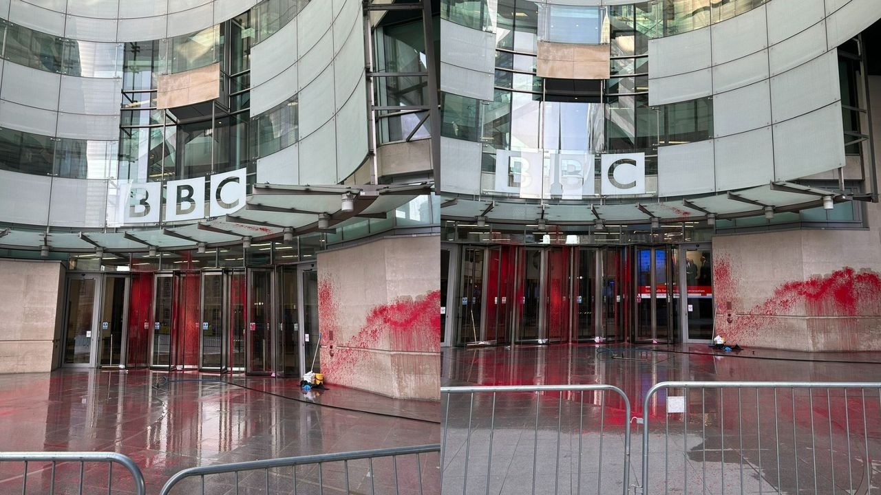 Cumartesi günü paylaşılan fotoğraflarda BBC binasının kapısının kırmızıya boyandığı ve görevliler tarafından temizlenmeye çalışıldığı görüldü.