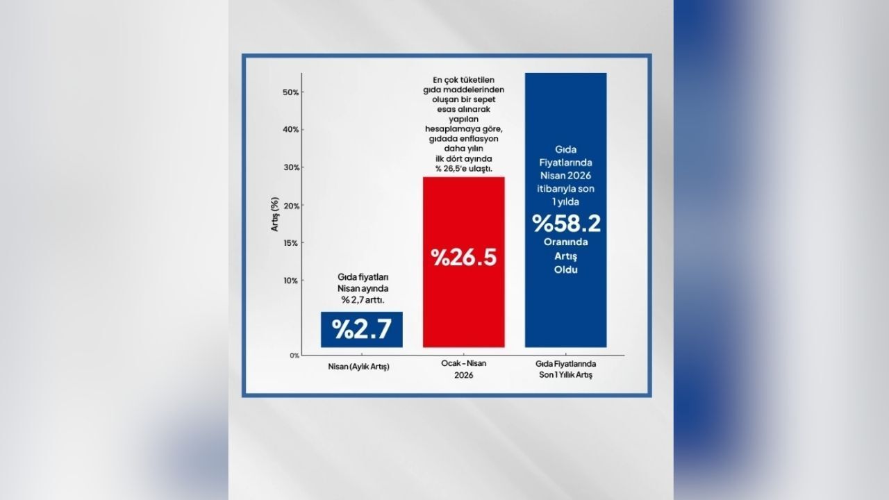 Mayıs 2025 - Nisan 2026 aylarına kapsayan son 12 aylık dönemin ortalama fiyatları, Mayıs 2024 – Nisan 2025 dönemindeki ortalama gıda fiyatlarına göre yüzde 53,9 oranında arttı. On iki aylık ortalama fiyat artışı ekmek, un, bulgur, makarna fiyatlarında yüzde 31,4, et-balık fiyatlarında 61,7, süt ve süt ürünleri ile yumurta fiyatlarında yüzde 33,4 oldu. 12 aylık ortalamalara göre yağ fiyatları yüzde 30,4, meyve fiyatları yüzde 129,4, sebze fiyatları ise yüzde 77,3 oranında arttı. Bakliyatta ortalama fiyatlar bir önceki 12 aylık ortalamaya göre yüzde 27,8, diğer gıda fiyatları ise yüzde 29,5 oranında yükseldi."