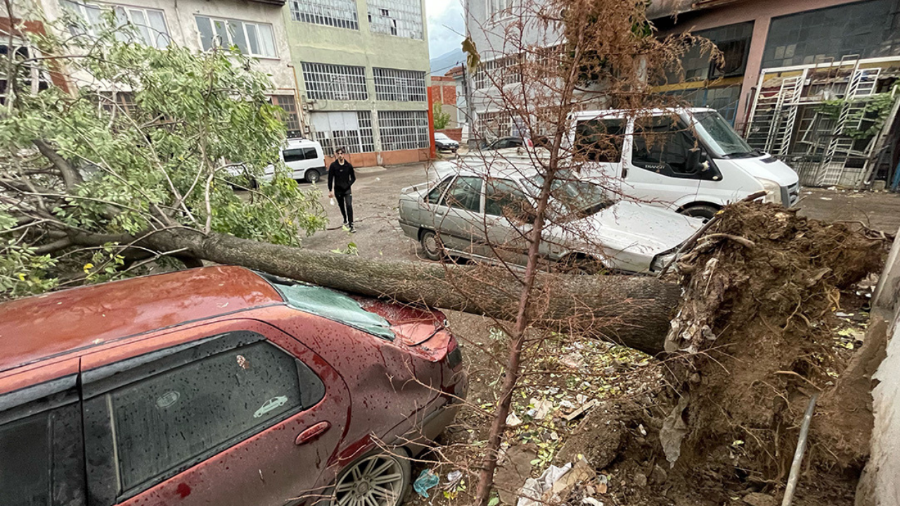 Bursa’nın Merkez Yıldırım ilçesinde rüzgâr dolayısıyla bir ağaç park halindeki araçların üzerine devrildi.