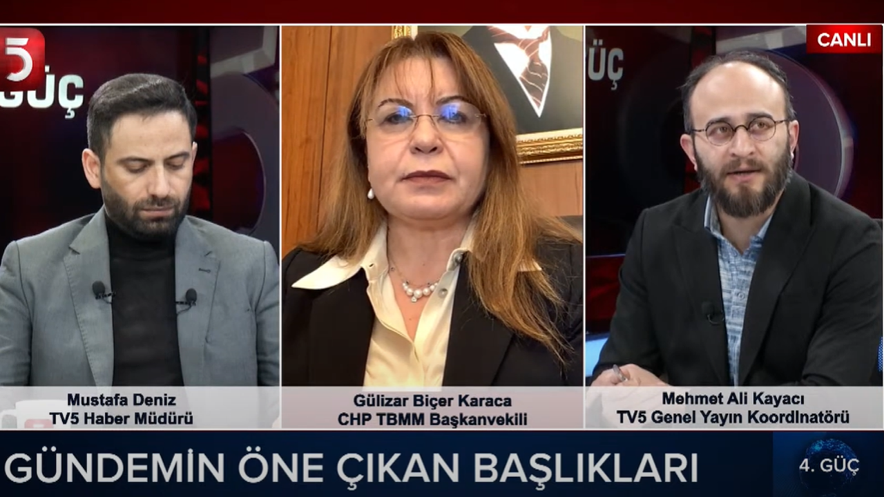 CHP TBMM Başkanvekili Gülizar Biçer Karaca erken seçim ve yeni anayasaya ilişkin TV5 televizyonunda yayınlanan 4. Güç programında açıklamada bulundu. "Ceketimi assam kazanır" anlayışının artık toplumda olmadığını kaydeden Karaca, "iktidara bir yüzükle ama bugün karun olmuş bir anlayışın karşısında sokakta ayda bir kilo kıyma alamayan, çocuğuna simit alamayan, süt alamayan annelerin olduğu bir süreçte toplum '2023 yılında biz hata yaptık' diyor" dedi.