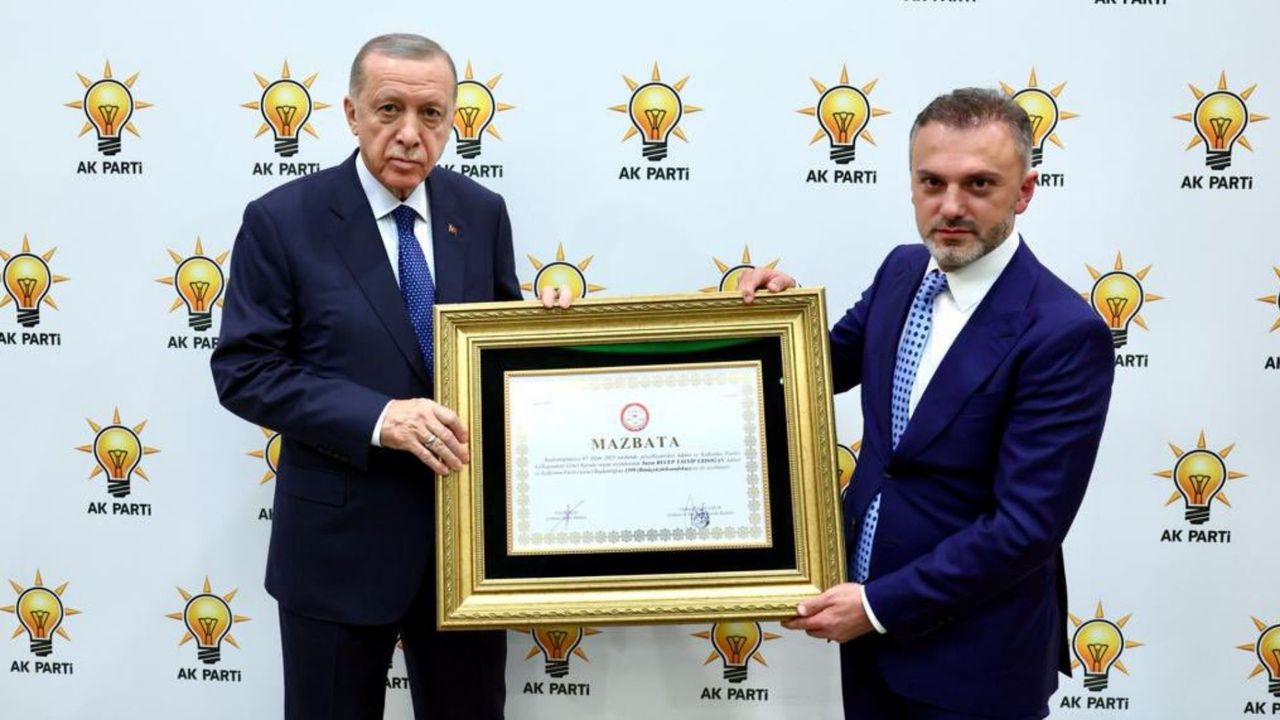 AK Parti Genel Başkan Yardımcısı Erkan Kandemir, sosyal medya hesabından yaptığı paylaşımda, Cumhurbaşkanı Erdoğan'a mazbatasının takdim edildiği ana ilişkin fotoğrafa yer verdi.