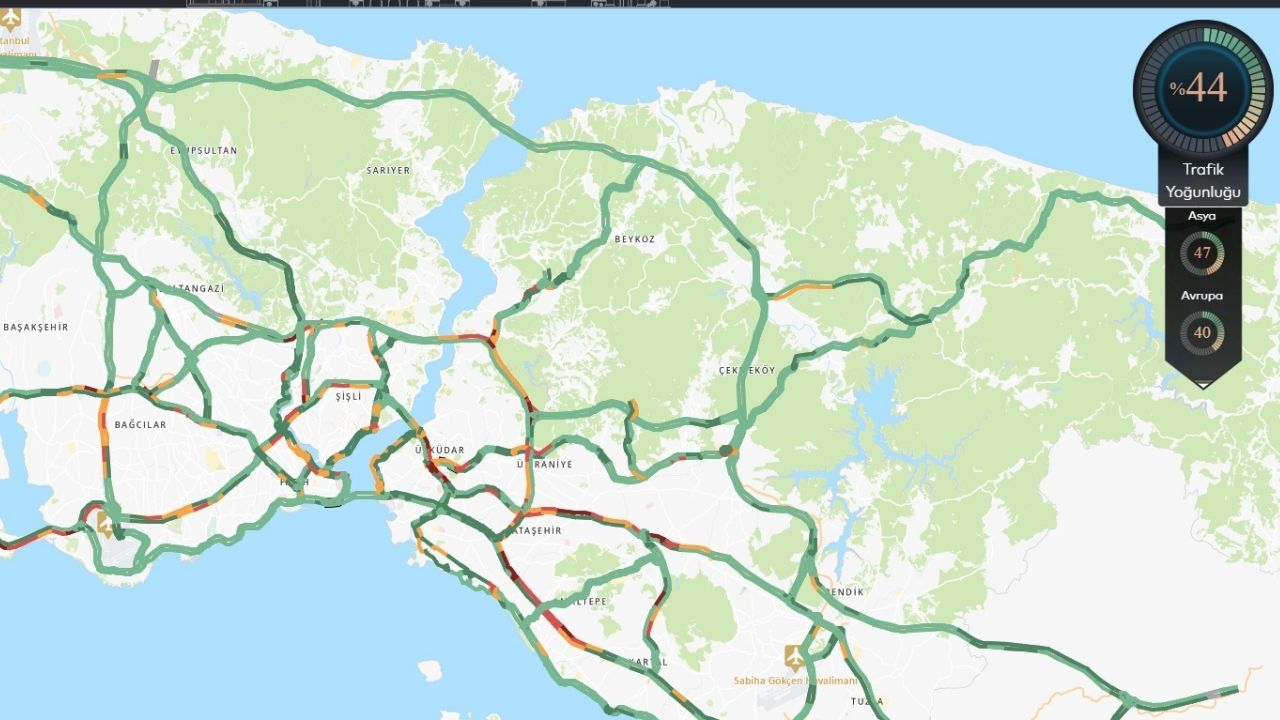 Haftanın son gününde kentin sakinliği trafik verilerine de yansıdı. trafik yoğunluğu İBB Trafik Yoğunluk Haritası'na göre yüzde 44 ölçüldü.