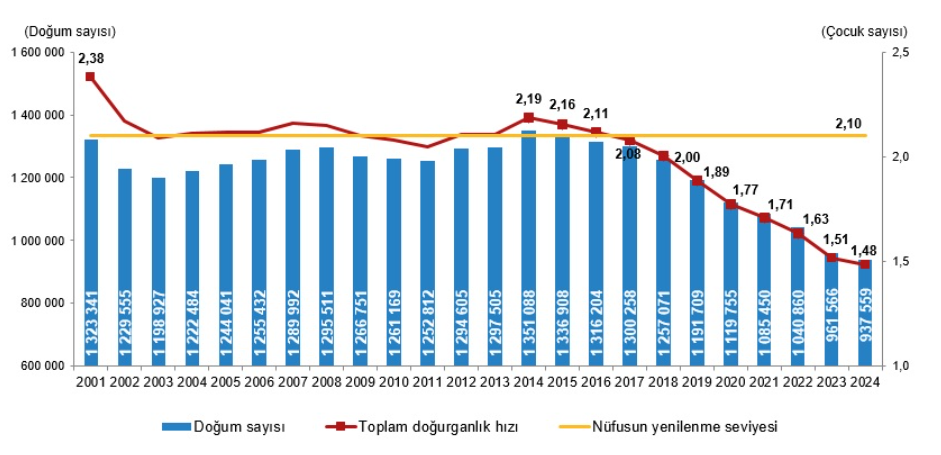 Toplam doğurganlık hızı, bir kadının doğurgan olduğu dönem olan 15-49 yaş grubunda doğurabileceği ortalama çocuk sayısını ifade etmektedir. Toplam doğurganlık hızı, 2001 yılında 2,38 çocuk iken 2014 yılından itibaren aralıksız düşüş eğilimine girerek 2024 yılında 1,48 çocuk olarak gerçekleşti. Toplam doğurganlık hızı son sekiz yıldır nüfusun yenilenme seviyesi olan 2,10'un altında kalmaya devam etti.