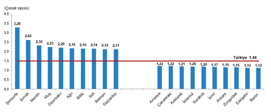 Toplam doğurganlık hızının en yüksek olduğu il 2024 yılında 3,28 çocuk ile Şanlıurfa oldu. Bu ili 2,62 çocuk ile Şırnak, 2,32 çocuk ile Mardin izledi.