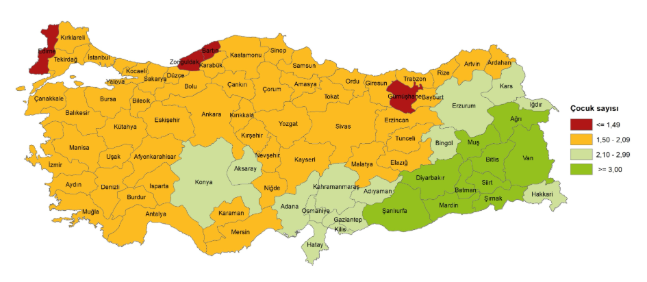 Toplam doğurganlık hızının en düşük olduğu iller ise 1,12 çocuk ile Bartın ve Eskişehir oldu. Bu illeri 1,15 çocuk ile Zonguldak ve Ankara, 1,17 çocuk ile İzmir izledi.