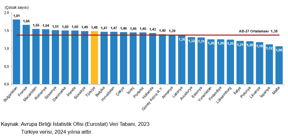 Avrupa Birliği üyesi 27 ülkenin toplam doğurganlık hızları incelendiğinde, 2023 yılında en yüksek toplam doğurganlık hızına sahip olan ülkenin 1,81 çocuk ile Bulgaristan olduğu, en düşük toplam doğurganlık hızına sahip olan ülkenin ise 1,06 çocuk ile Malta olduğu görüldü. Toplam doğurganlık hızı 2024 yılında binde 1,48 olan Türkiye, Avrupa Birliği üyesi ülkeler arasında 9. sırada yer aldı.