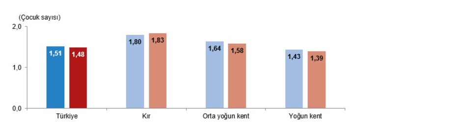 Kent-kır sınıflamasına göre toplam doğurganlık hızı incelendiğinde, 2024 yılında kır olarak sınıflandırılan yerlerde toplam doğurganlık hızı 1,83 çocuk iken orta yoğun kent olarak sınıflandırılan yerlerde 1,58 çocuk ve yoğun kent olarak sınıflandırılan yerlerde ise 1,39 çocuk oldu.