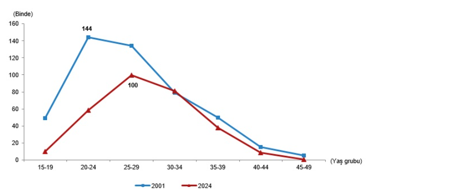 Yaş grubuna göre doğurganlık hızı incelendiğinde, 2001 yılında en yüksek yaşa özel doğurganlık hızı binde 144 ile 20-24 yaş grubunda iken 2024 yılında binde 100 ile 25-29 yaş grubunda görüldü. Bu durum, doğurganlığın kadının daha ileri yaşlarında gerçekleştiğini gösterdi.
