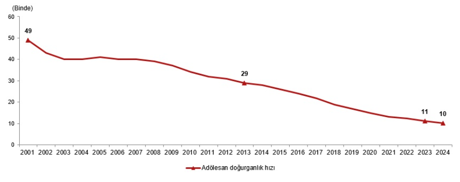 Adölesan doğurganlık hızı, 2001 yılında binde 49 iken 2024 yılında binde 10'a düştü. Diğer bir ifadeyle, 2024 yılında 15-19 yaş grubundaki her bin kadın başına 10 doğum düştü.