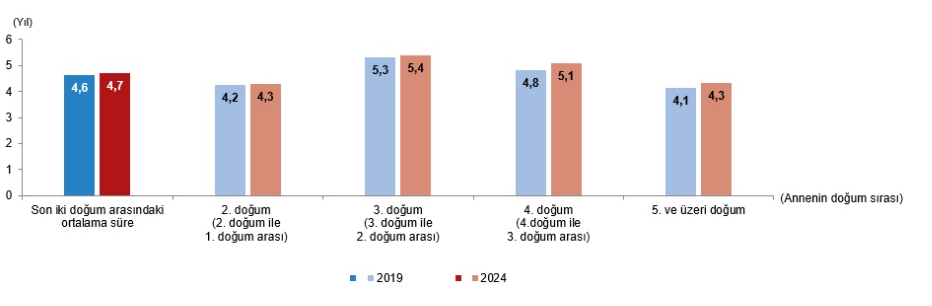 Annenin "son iki doğumu arasındaki ortalama süre"(2) incelendiğinde, bu süre 2019 yılında 4,6 yıl iken 2024 yılında 4,7 yıl oldu.