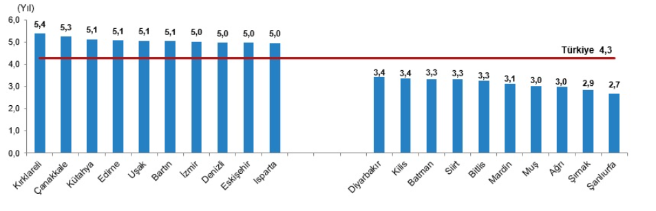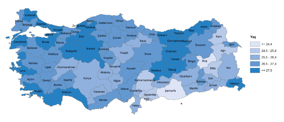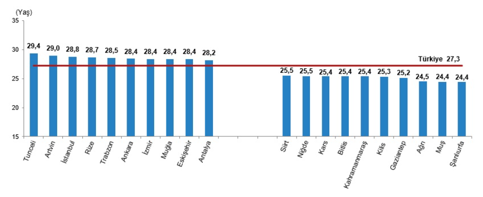 İlk doğumdaki ortalama anne yaşının en düşük olduğu iller ise 24,4 ile Şanlıurfa ve Muş oldu. Bu illeri 24,5 yaş ile Ağrı, 25,2 yaş ile Gaziantep izledi.