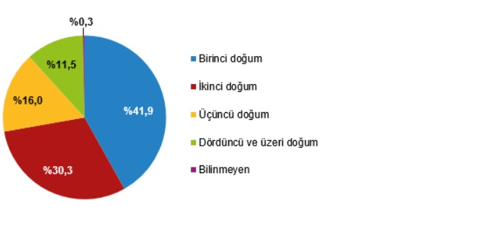 Doğum sırasına göre doğumlar incelendiğinde, 2024 yılında doğumların %41,9'unun ilk, %30,3'ünün ikinci, %16,0'ının üçüncü, %11,5'inin ise dördüncü ve üzeri doğum olarak gerçekleştiği görüldü.