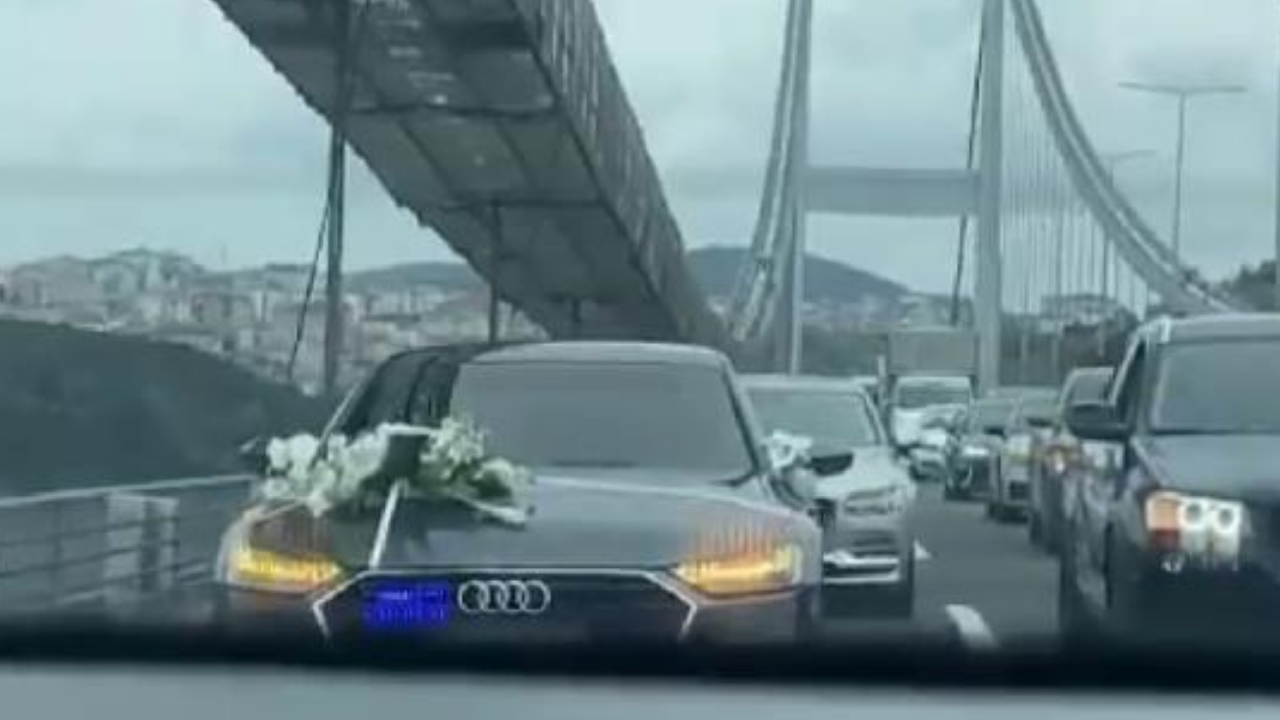FSM Köprüsü'nde tüm şeritleri kapatan düğün konvoyu trafiği yavaşlattı. Konvoydaki çakarlı gelin aracı dikkat çekerken, konvoydakiler camlardan çıkarak yaktıkları meşalelerle ilerledi.