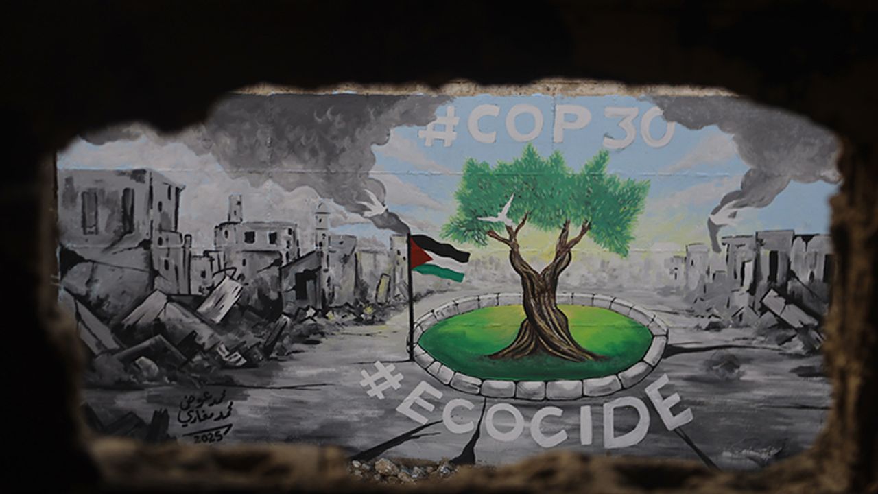 Gazze Şeridi'nin güneyindeki Han Yunus kentinde düzenlenen etkinlikte bir duvara "gri renkli yıkıntıların, molozların, bombardıman sonrası gökyüzüne yükselen kara dumanların ortasında yeşermiş bir ağaç" resmedildi ve altına da "COP30 ve ECOCIDE" yazısı yazıldı.