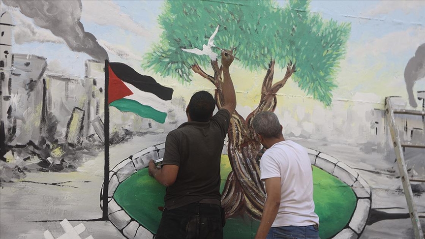 Etkinliğe katılan Filistinli sanatçı Muhammed el-Mağari (41), çizdikleri duvar resmiyle Gazze'de yaşanan soykırımı çok basit bir şekilde de olsa anlatmak istediklerini aktardı.