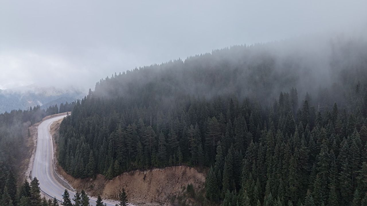 Çam ağaçlarıyla bütünleşen sis, dron ile görüntülendi.
