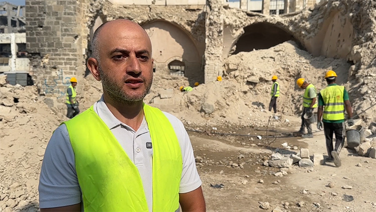 Teknisyenler ve işçiler, çoğunluğu enkaza dönen saraydan geriye kalanları kurtarmak için molozlar arasında çalışıyor. İlkel ekipman ve kısıtlı imkanlarla etrafa saçılmış tarihi eserlere ait parçaları arayan teknisyenler, Gazze'nin tarihi kimliğinden geriye kalanları korumaya çalışıyor.