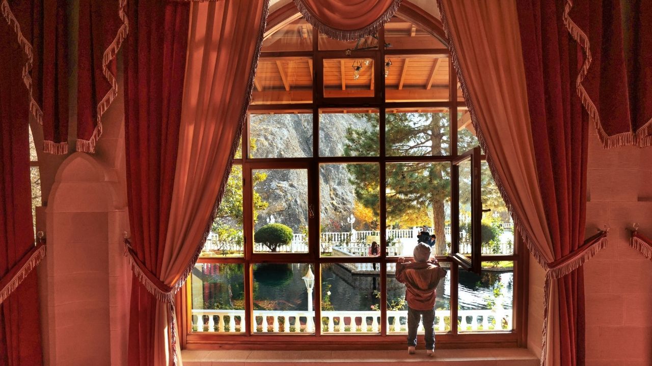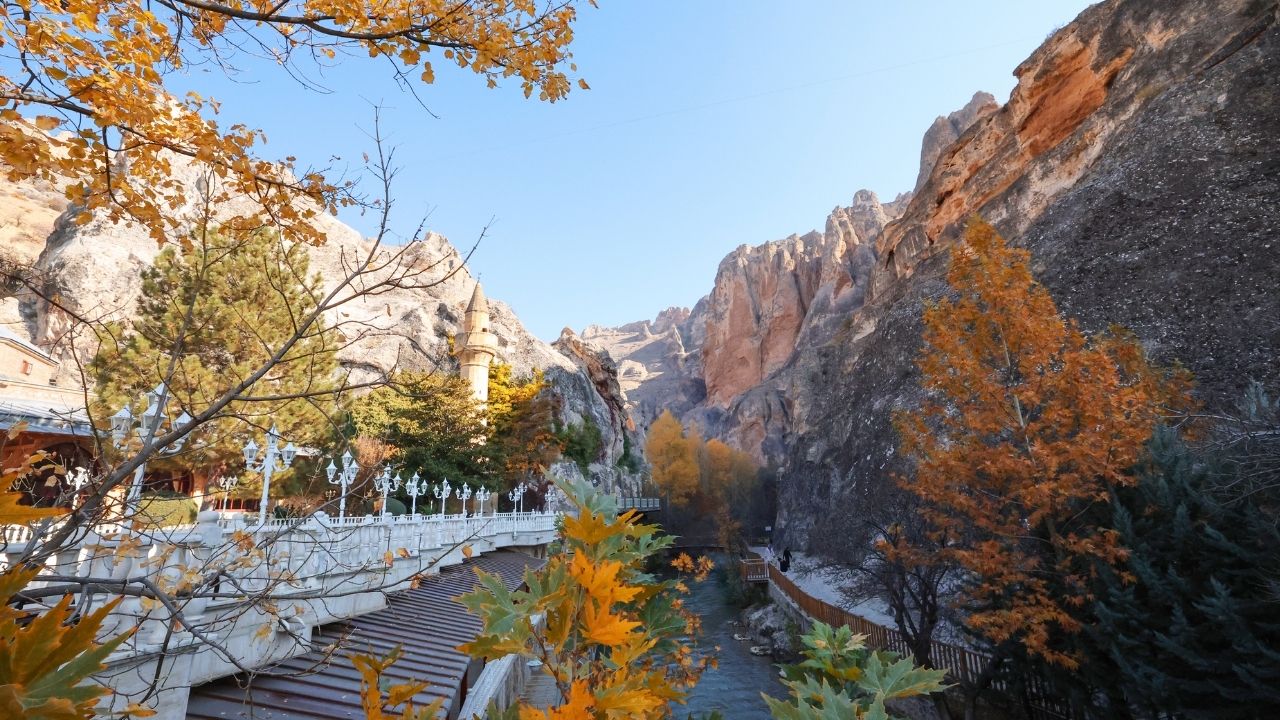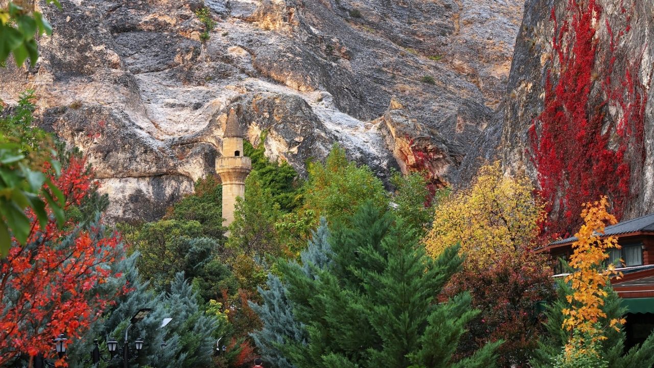 Külliye alanındaki yüksek kayalıklara tırmanan sarmaşıklar ve etrafındaki ağaçlar, renk cümbüşüyle ziyaretçilerine doyumsuz bir manzara sunuyor.