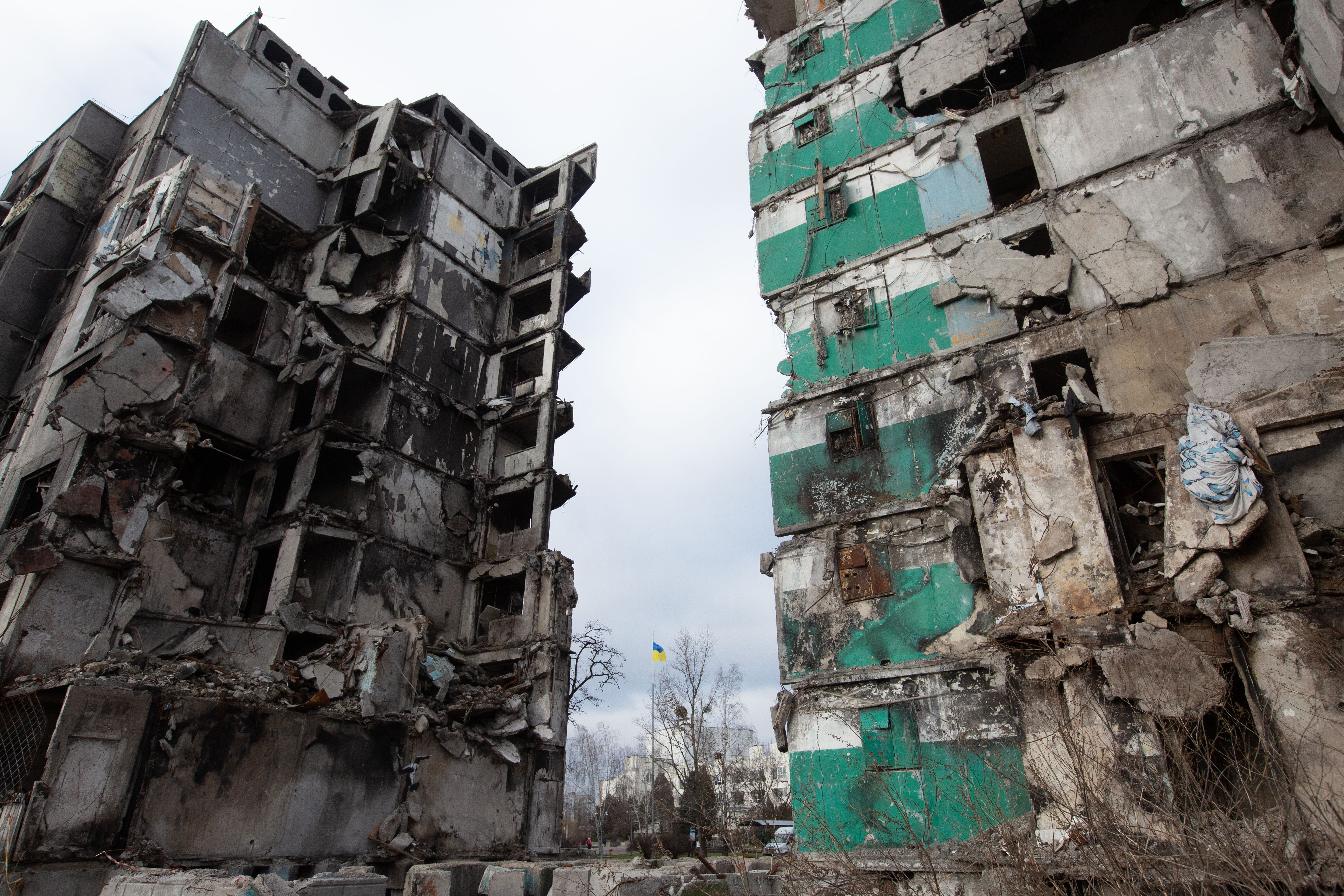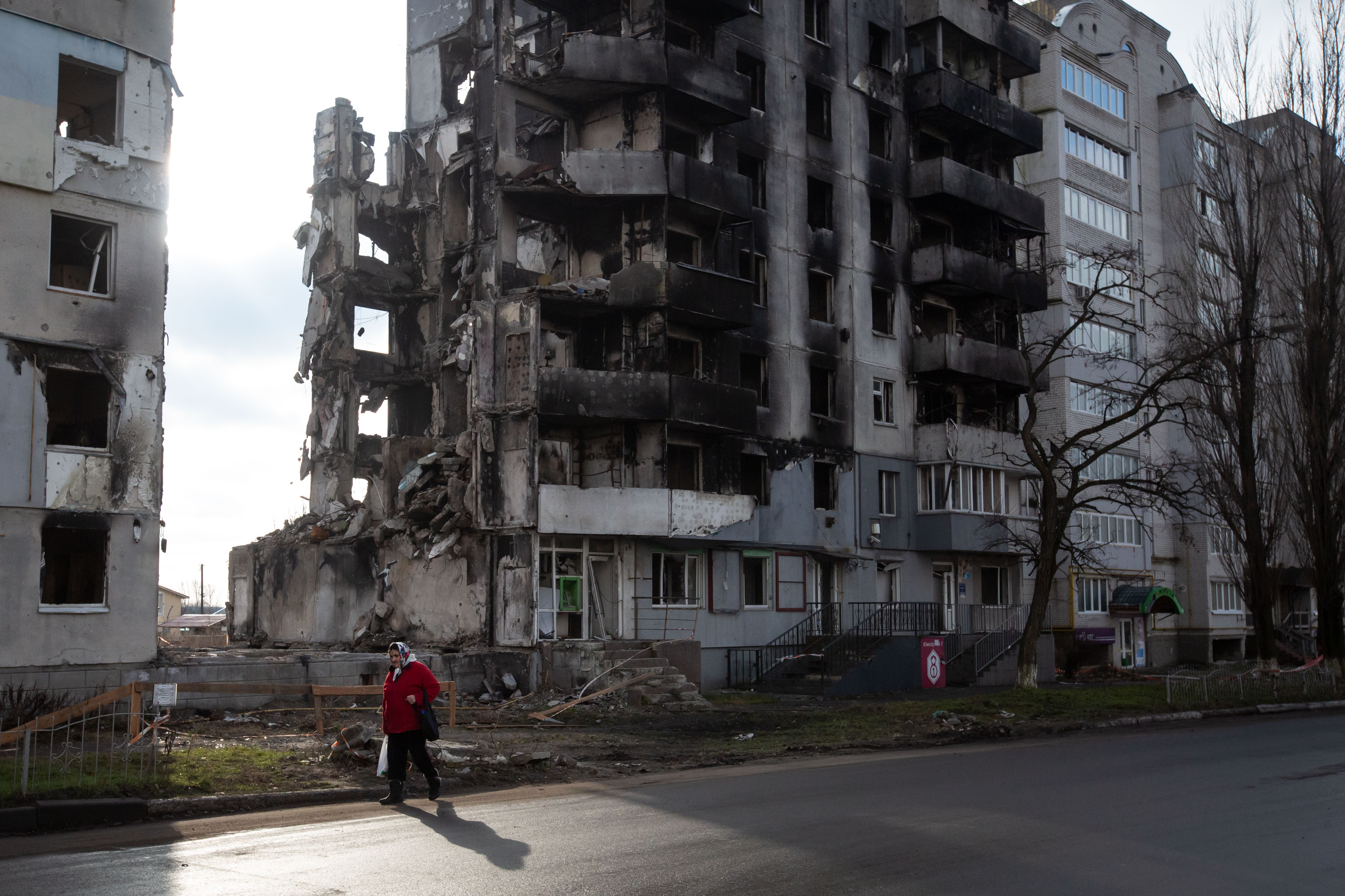 Rus güçlerinin düzenlediği füze saldırıları sonucunda Ukrayna'nın Kiev Bölgesi'ne bağlı Borodyanka kasabasında hasar gören binalar görüntülendi.