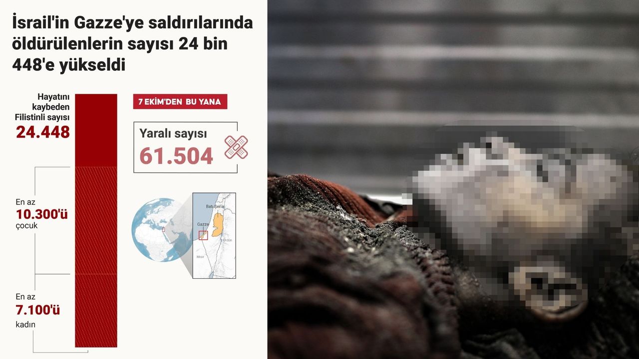İşgalci İsrail'in abluka altındaki Gazze Şeridi'ne 7 Ekim'den bu yana düzenlediği saldırılarda şehit edilen Filistinlilerin sayısı 24 bin 448'e ulaştı.