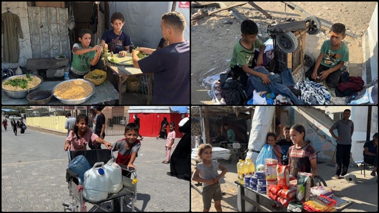 Gazzeli çocuklar, Han Yunus'taki sığınma merkezinin yakınında yer alan pazarda geçimlerini sağlayabilmek için insan gücüne ihtiyaç duyan makinalarda nohutları öğüterek felafel yapıyor, ağır arabaları çekiyor, meyve, sebze, bisküvi gibi ürünler satmaya çalışıyor.