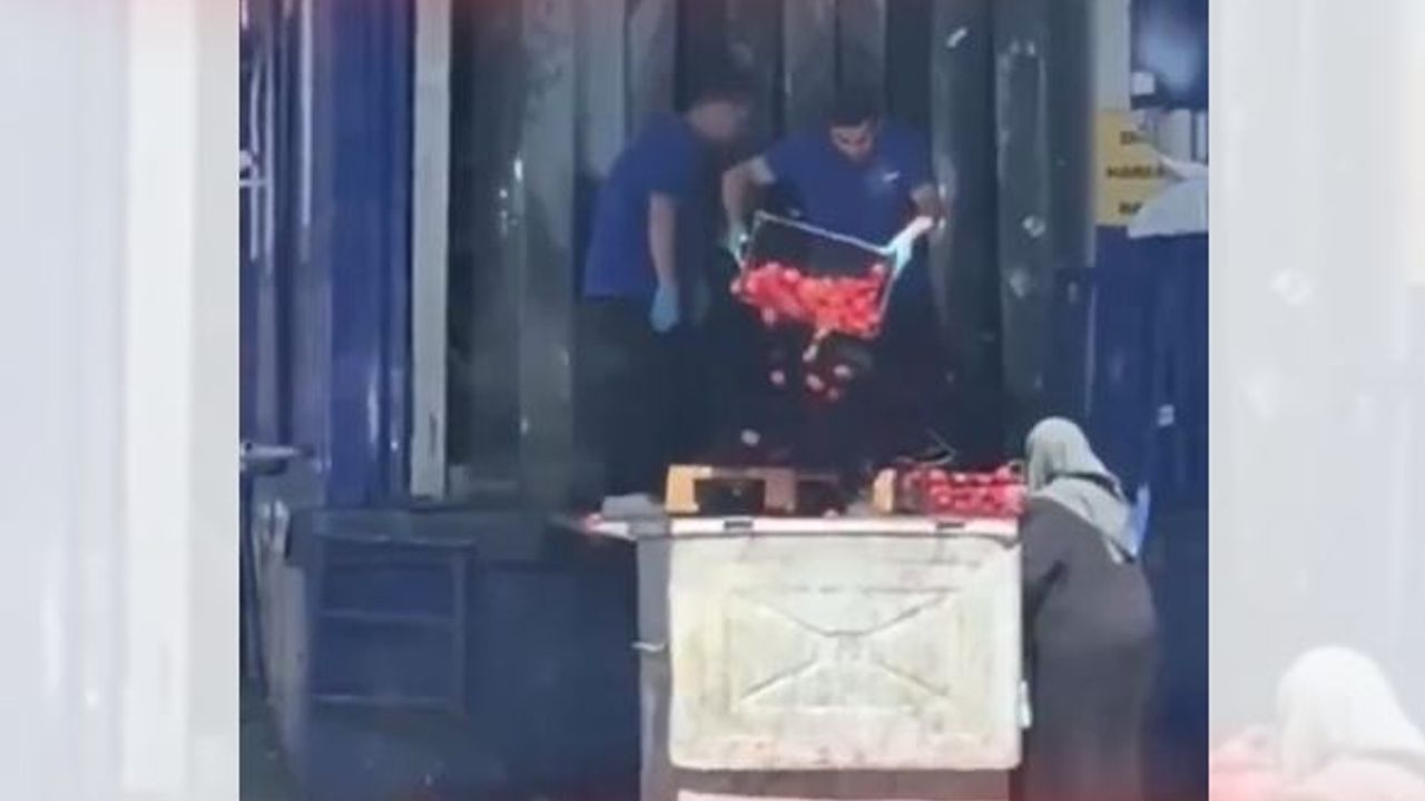 O anlar bir vatandaşın cep telefonu kamerasına yansırken, domateslerin çöpe dökülmesi tepkilere neden oldu.