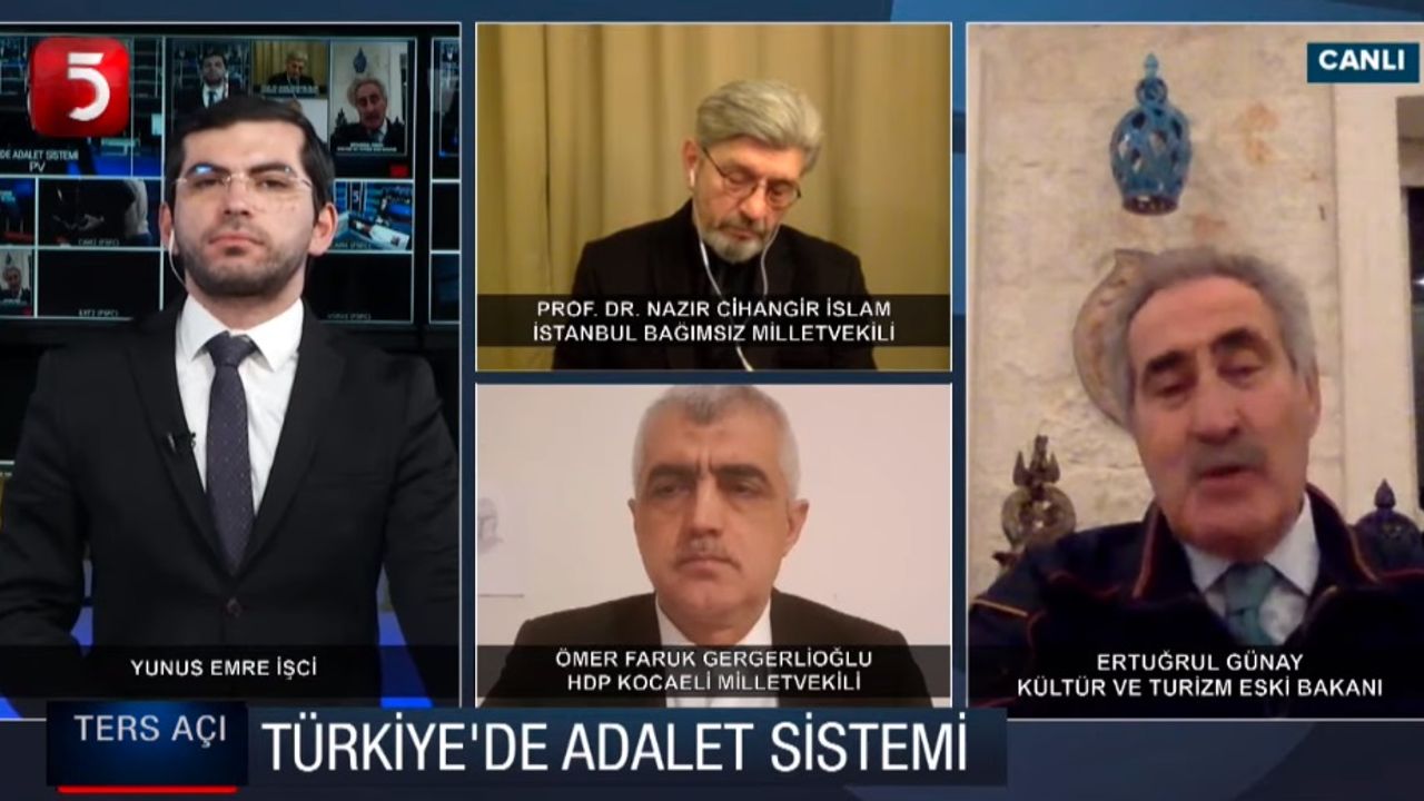 HDP Miletvekili Ömer Faruk Gergerlioğlu ve Milletvekili N. Cihangir İslam ile TV5'te yayınlanan Yunus Emre İşçi ile Ters Açı programına katılan Eski Kültür ve Turizm Bakanı Ertuğrul Günay gündemi değerlendirdi.