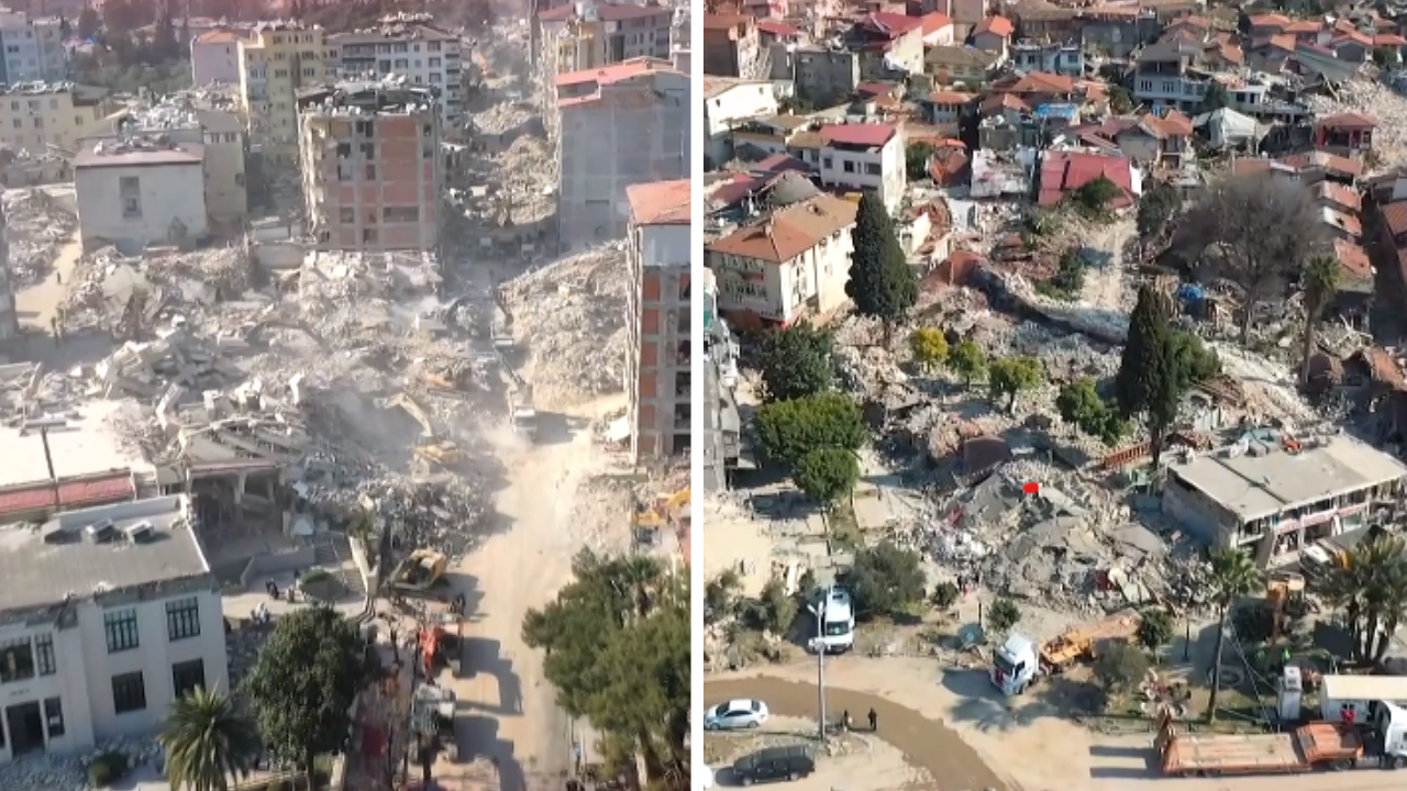 "Asrın felaketi"nden etkilenen illerden Hatay'da, deprem öncesi ve sonrasında kentin işlek caddelerinde havadan çekilen görüntüler yıkımın boyutunu gözler önüne serdi.