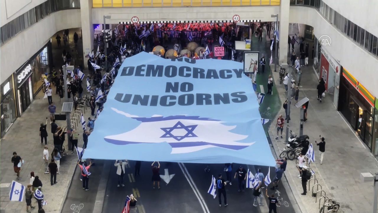 Başkent Tel Aviv'deki Kaplan Caddesi'nde toplanan göstericiler, hükümetin politikalarına karşı sloganlar attı.