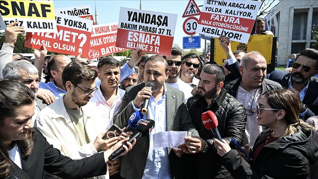 İBB'nin Saraçhane'deki başkanlık binası önünde bir araya gelen özel halk otobüsü sahipleri, "Aynı yolu sürüyoruz, eşit muamele istiyoruz", "Ekrem Başkan esnaf çaresiz kaldı" ve "İETT'nin araçları yolda kalıyor, fatura halk otobüsçüsüne kesiliyor" yazılı pankartlar açıp, slogan attı.